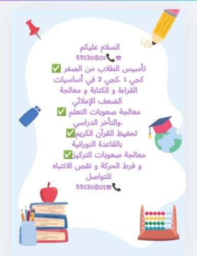 السلام عليكم معكم مدرسه للمرحلة الابتدائية لجميع المواد مع مراجعة الدروس و حل الواجبات بشكل يومي للتواصل على الواتساب او الاتصال 55130801