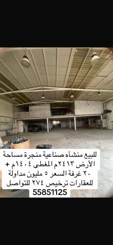 مخزن في بركة العوامر مع شهادة إتمام البناء مساحة القسيمة 2050م" مساحة البناء 1940 م" مقسوم نصفين - نص مفتوح بالكامل مخزن وأغراض أخرى للبضائع المعدنيه والسيراميك - سكن داخلي معزول غرفه وحمام ومطبخ - وسكن خارجي عباره عن كبينه غرفتين وحمام - ونص المخزن معزول بالكامل وفيه مكتب وميزانين للبضائع الخفيفه. السعر 3400000 للتواصل 50101114 القلايل للوساطة العقارية ترخيص 12
