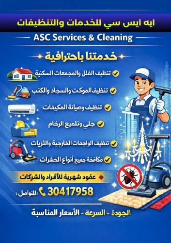 شركة ASC للخدمات العامةالشركة القطرية المتخصصة في الشركة القطرية المتخصصة في خدمات التنظيف، نقدم حلول تنظيف متكاملة تلبي جميع احتياجاتكم السكنية والتجارية وفق أعلى معايير الجودة والاحترافية.خدمات التنظيف بعض خدماتنا: • تنظيف المنازل والفلل • تنظيف المكاتب والشركات • تنظيف الزجاج والنوافذ • تنظيف السجاد والموكيت • تنظيف المطابخ والحمامات • تنظيف الأثاث والمفروشات • تلميع وتنظيف جميع أنواع الأرضيات لجميع خدمات التنظيف: 30417958 للعقود والتعاون التجاري: 59992595