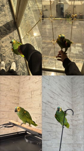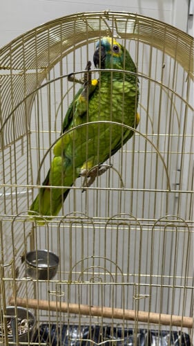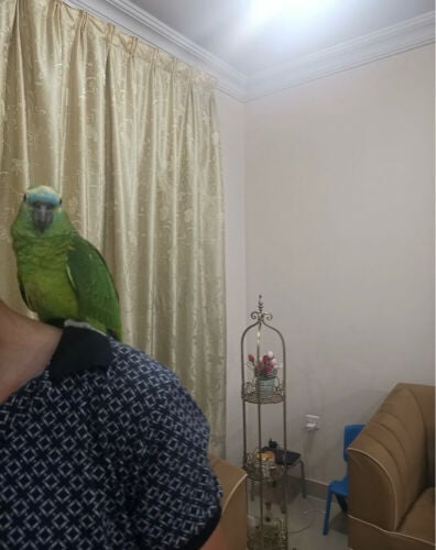 بغبغاء امزون بلو فرونتد عمره سنه بدايت كلام مشاءالله صحه غير اليف لايعض سعره٣٥٠٠ريال مع القفص
