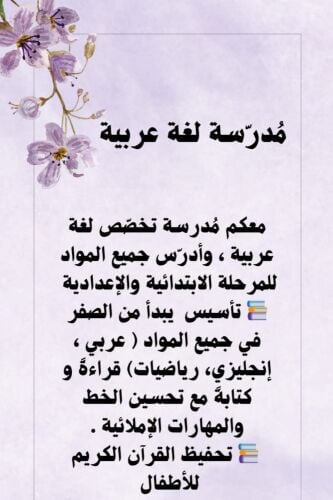 معلمة تأسيس حضوري ،انا بأسس الطفل من اول مسكة القلم ،وكمان على كيفية القراءة والكتابة والإملاء والحساب الذهني وكيفية التعامل معها بطريقة سهلة وبسيطة و طرق نطق الحروف و الكلمات بكل دقة ومعرفة الالوان وتفريقها لل (كج١,كج٢)،وكمان بدرس جميع المواد للمرحلة الابتدائية ومتابعة الدروس و حل الواجبات / لمن يهمه الامر يتواصل معي واتساب 51039812