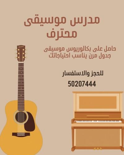 بكالوريوس موسيقى خبرة أكثر من 15 سنة تأسيس قوي + تطوير مهارات العزف بأسلوب عملي وممتع دروس خاصة في المنزل متابعة شخصية لضمان تقدمك مواعيد مرنة رقم التواصل : 50207444