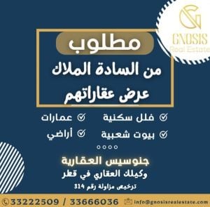 (( مطلوب من المالك عقارات )) • فلل . • اراضي . • مجمعات . • عماير . • بيوت شعبية . • اسواق تجارية . • ابراج . (( للبيع او للايجار )) • في اي منطقة داخل دولة قطر . - لدينا قاعدة كبيرة من عمليات التسويق والدعايه . - لدينا قاعدة كبيرة من المستثمرين . - لدينا قاعدة كبيرة من الطلبات والزبائن الجادة . للتواصل 77770715 شركة لوكيشن للعقارات