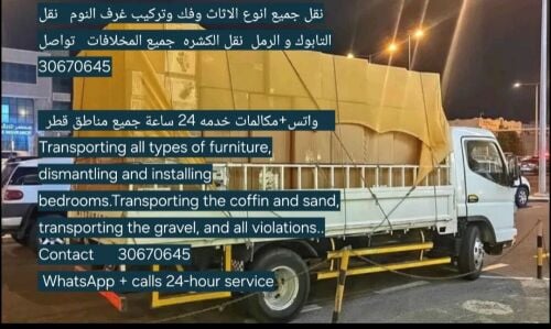 السلام عليكم : "عثمان " لنقل جميع انواع الاثاث فك وتركيب غرف النوم نقل التابوك والرمل نقل الكشره وجميع المخلافات يوجد عمال لتكسير بيع وشراء الاثاث وشراء الحديد ( جميع الاسكراب) لتواصل " 30670645 " مكالمات + واتساب خدمه ع مدار ال 24 ساعة جميع مناطق قطر
