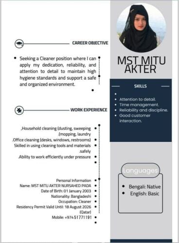 Dedicated and detail-oriented Housekeeper with experience in maintaining high standards of cleanliness and hygiene in hotel and corporate environments. Skilled in room cleaning, laundry services, and the use of cleaning equipment and chemicals safely and efficiently. Known for reliability, professionalism, and strong time management skills. Committed to providing excellent guest and staff satisfaction by ensuring a clean, organized, and welcoming environment at all times. I can do Laundry work, I'm still working in a laundry.
