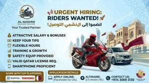 URGENT HIRING: Join Al Nashmi Delivery Service! Are you looking for a great career opportunity as a rider? Join Al Nashmi Delivery Service and start working with Qatar's top delivery platforms: Roffiq and Snoonu! We are currently recruiting dedicated Car Riders and Bike Riders to join our growing team. Why Join Us? Attractive Salary & Performance Bonuses Earn Extra with Delivery Tips Flexible Working Hours to suit your schedule Professional Training & Growth Opportunities Safety Equipment & Full Support Provided Requirements: Valid Qatar Driving License (Car/Bike) Knowledge of local routes and areas Proficiency in using smartphones Clean driving record Don't miss out on this opportunity! Become a part of our professional team today. Apply Online: Contact Us Directly: +974 3069 3130 Al Nashmi Delivery Service Your Trusted Partner