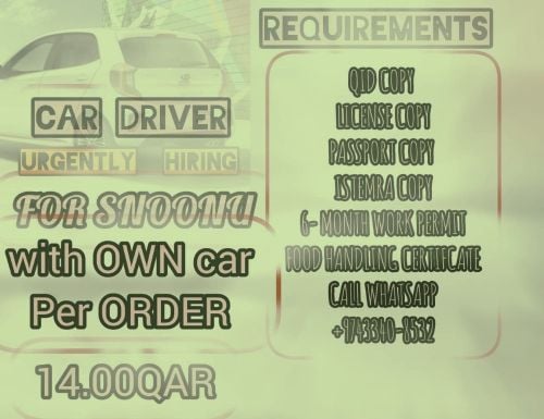We’re Hiring Car Driver! Do you have a Qatar Car Driving license and delivery experience? Whether you're in Qatar or abroad, this is your chance to drive into success with Retro Delivery Service! We Offer: Free Visa (Only for candidates with Qatar Bike driving license) Visa available for Kenya, Nepal, Pakistan ,Sri Lanka India Bangladesh. Note: Qatar Car Driving license is required. WhatsApp Only: 77476550 WhatsApp Only: 33404029