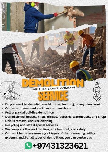 "Get rid of the old, start building the new!"Professional Demolition ServicesDo you want to demolish an old house, building, or any structure?Our expert team works with modern machineryComplete or partial building demolitionDemolition of houses, villas, offices, factories, warehouses, and shopsDebris removal and site cleaningRecycling and safe disposal servicesWe complete the work on time, at a low cost, and safely.Our work includes removing all types of tiles, removing ceiling gypsum, and, for all types of demolition, you can contact us
