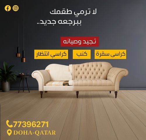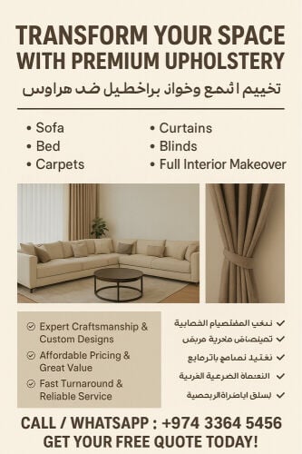 Welcome to Hassan FURNITURE Our services Making new Sofa set, Arabic molise.l New curtains,carpet, vinyl PVC/Bakia, wallpaper Making, selling & fixing. For more information call= 77735054