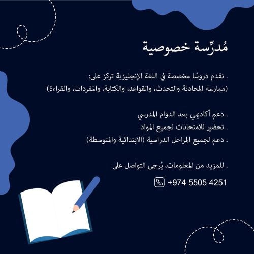 An English language teacher specialized in teaching all grade levels using the easiest and most enjoyable methods. Providing academic support for all grade levels — Independent and International schools. Teaching Math and Science for the primary stage. Teaching all primary school subjects. Arabic language foundation using the Noor Al-Bayan method. Qur’an memorization with Tajweed and Al-Qaida Al-Norania for children and women. For contact: 33648567