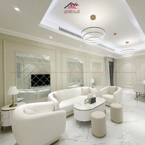 Villa specifications: Ground floor: Living room Reception bathroom Kitchen Master bedroom First floor: 3 master bedrooms Small living room Penthouse: Master bedroom Price: 13,000 QAR