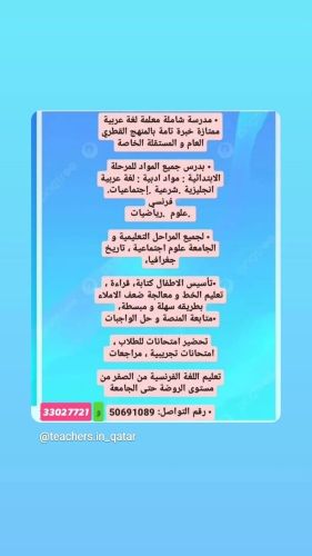 •مدرسة لغة عربية ، تاريخ و جغرافيا ، تربية اسلامية للجميع المراحل • لغة انجليزية للصفوف الاولى /( •لغة فرنسية لجميع المراحل // متحصلة على باكالوريا