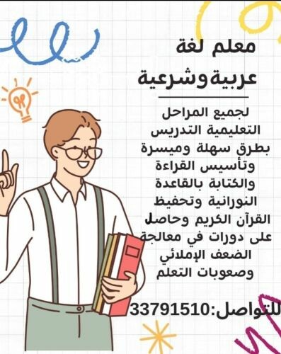 محفظ قرآن أزهري مدرس لغة عربية وشرعية لجميع المراحل ومحفظ قرآن كريم بالقاعدة النورانية وحاصل على دورات في معالجة الضعف الإملائي وصعوبات القراءة للتواصل 33791510