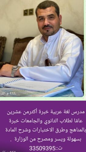 مدرس لغة عربية مصري خبرة أكثر من عشرين عاما لطلاب الثانوي والجامعات خبرة بالمناهج وطريقة الاختبارات وتبسيط المادة ومعالجة كل الأخطاء ت:33509395