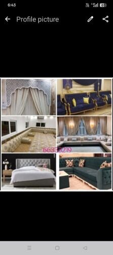 تفصيل وتنجيد مفروشات تنجيد كنب وكراسي تفصيل جميع المجالس والجلسات بيع وتركيب ورق جدران بيع وتركيب باركيه تفصيل وتركيب ستائر بيع وتركيب موكيت وسجاد بيع وتركيب مشمع جميع أعمال الصبغ . يوجد عشب صناعي بيع وتركيب وجميع اعمال النجارة