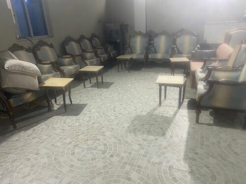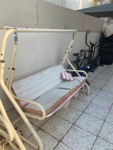 جلسة خارجية حديد جديدة ثلاث قطع كنبتين وزاوية مع المساند باكياسهم جديد مع طاولة في الكرتون لم يتم التركيب