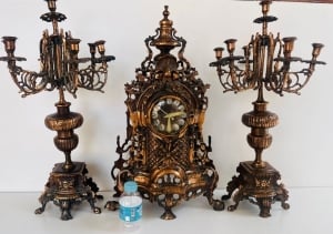 طقم فنتج يتكون من شمعدانين مع ساعة مكتبية قديمة