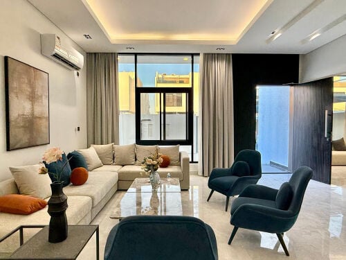 للإجار في مشروع جديد فيلة مستقلة أول ساكن متكونة من طابق أرضي ٢ صالة مع غرفة أكل حمام ضيوف مطبخ مقفول غرفة مع حمام مغسلة الدور الأول ٣ غرف مستر تراس كبير الدور الثاني غرفة مستر مع تراس حوش أمامي و خلفي