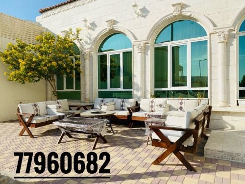 كراسي ٧ اشخاص للمجالس مع طاولتين صغار وطاوله كبيره رخام اصليي مع مخداتهم استعمال بحاله ممتازه