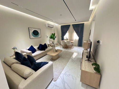 للايجار شقة بالؤلؤة 3 غرف نوم مفروشة فرش كامل سوبر لوكس تشطيب راق و مساحات مميزة شامل الخدمات موقع ممتاز و اطلالة رائعة جاهز للسكن