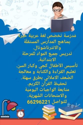 لكل أم طفلها ضعيف في القراءة أو الكتابة أو الإملاء معكم : مدرسة تأسيس للمرحلة. الابتدائيةو ماقبلها كجي1و كجي2،تأسيس في القراءةو الكتابةو الخط . معالجة صعوبات التعلم . معالجة الضعف الإملائي و الاخطاءللغوية للطلاب. متابعة الدروس و حل واجبات المنصة. تحفيظ القرآن الكريم للتواصل66296221
