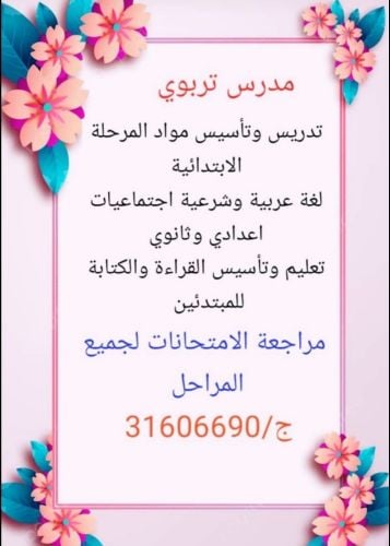 مدرس خبرة بتدريس مواد المرحلة الابتدائية،لغة عربية وشرعية اجتماعيات إعدادي وثانوي مراجعة الامتحانات لجميع المراحل مع نماذج الامتحانات. ج/31606690