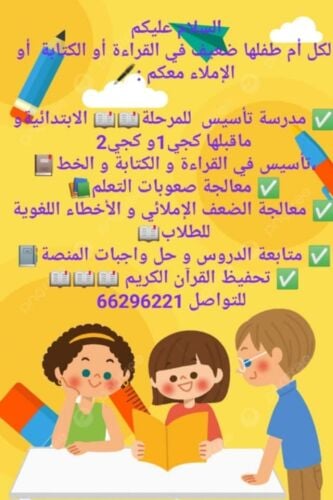 66296221 مع اقتراب الإختبارات لكل من يحتاج تأسيس طفله وتحسين مستواه،معكم مدرسة جميع المواد، للمرحلة الابتدائية. تأسيس يبدأ من الصفر،كجي1 وكجي 2، تأسيس على القراءة و الكتابة و معالجة الضعف الإملائي،تحسين مستوى الخط،تعديل مخارج الحروف لنطق الصحيح تأسيس شامل "عربي ، رياضيات،انجليزي"، مع متابعة الدروس و حل الواجبات معالجة صعوبات التعلم و تعديل السلوك و فرط الحركة تحفيظ القرآن الكريم موجودةب لوسيل الخور، معيذر،مريخ،الخريطيات،أم قرن، المسيلة، الثمامة، الصخامة والعزيزية بالوكرة الوكير والسيلية،والريان وبني هاجر،الغرافة،أزغوى..... للتواصل واتساب او اتصال66296221