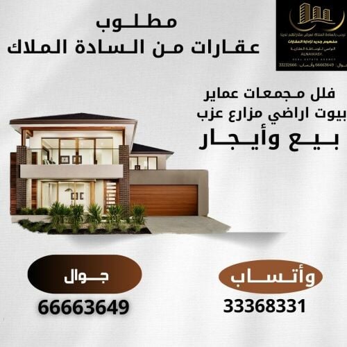 مــــطـــــلـوب أرض ســـكـنيـة الـصخـامـة أم قـرن عـلـــى أن تــكــــون شـــارعــــيـن أو شــــارع كـبيـــــر الـمســـــاحـة. بـين 450 الـى 500 وبــسعـر الــسـوق للتواصـــــــل. النـواصـي للـوسـاطـة العـقـاريـة جـــــــوال. 66663649