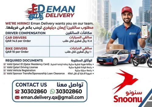 مطلوب سائقين للعمل بشكل فوري مع شركه سنونو للتواصل يرجى الاتصال على الرقم التالي 30072606