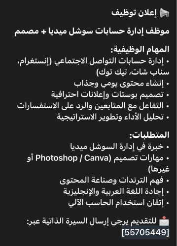مطلوب صانع/ة محتوى لديه خبرة في تصوير وصناعة محتوى الأزياء. المتطلبات: • أن يكون مستخدم آيفون • لديه خبرة في تصوير صور وفيديوهات فاشن بجودة عالية • يفهم الزوايا والإضاءة والتنسيق وطريقة إظهار منتجات الأزياء بشكل جذاب • لديه خبرة في صناعة محتوى للسوشيال ميديا • يفضل أن تكون لديه أعمال سابقة في مجال الأزياء أو تصوير المنتجات للمهتمين، يرجى إرسال الأعمال أو البورتفوليو على الواتساب ٥٥٢٣٣٨١٣