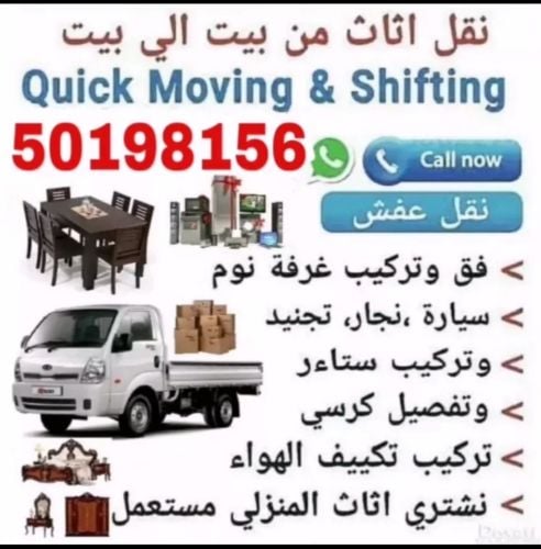 Sir / Madam Shifting moving service https://wa.me/97450351679 Looking for Shifting, moving, transportation, Please contact here call :50351679 We do all types of home service items.Home, villa, office Moving / Shifting.We are all kinds of bedroom set furniture.We have expert carpenter for dismantling and fixing furniture.Our service is available all over Qatar Services include ...... * House Shifting, Room Shifting & Office Shifting * Painting, plumbing, electronics, partition, car parking * Furniture Dismantling and Fixing * Packing & unpacking (bubble rap packing for glasses) * Pick Up & Delivery * A / c Maintenance & Shifting * Carpenter & labour ** We are buy your house used f