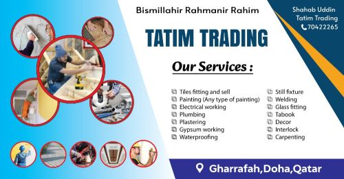 Tiles fitting and sell Painting any type of painting Electrical working Plumbing Plastering Gypsum working Waterproofing Still fixture Welding Glass fitting Tabook Decor Interlock Carpenting Shahab uddin Tatim trading Gharrafah,Doha,Qatar 70422265