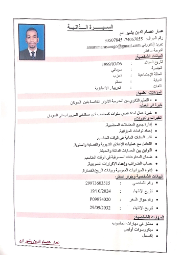 لدي خبره في المجال اشتغلت في شركه رار موترز لي السيارات وفي شركة الرحمه لي الرخام يوجد لدي خبره جيدا جدا في السودان محاسب ومتحصل الاكتروني في مؤسسه حك