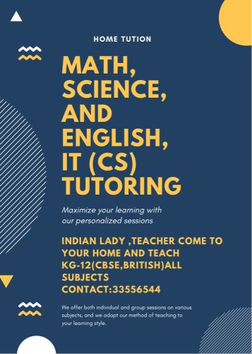 Indian Female tutor Teach mathematics and Information communication Technology and science till 10th(British,CBSE) Contact:33556544