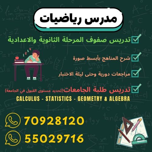 مدرس رياضيات خبرةطويلة فى تدريس الرياضيات والفيزياء لصفوف المرحلة الثانوية العامة والمرحلة الاعدادية والجامعة