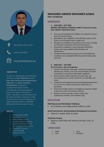 I have 5 Years Experience in Swimming Pool Technician Experience